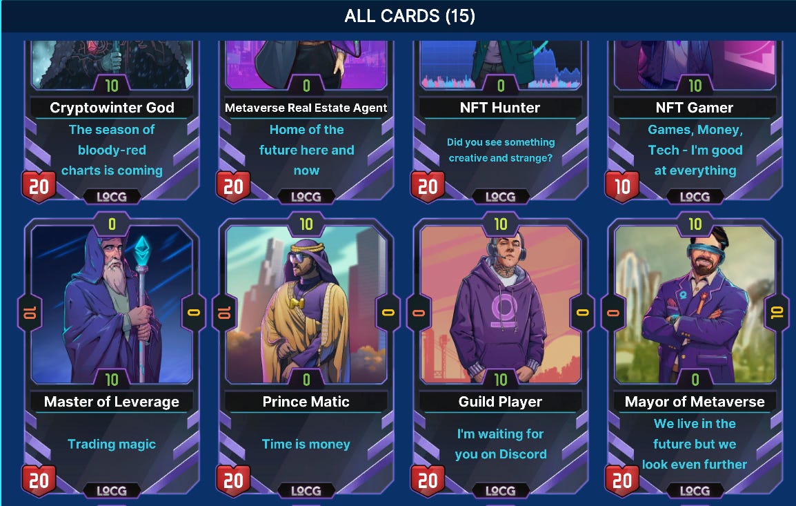 The first thing that caught our eye about Legends of Crypto was the fun inside humour. It’s a card-based strategy game where players compete to occupy the most spaces on a 3 x 3 grid. A bit like a more violent version of tic-tac-toe, with crypto personalities.