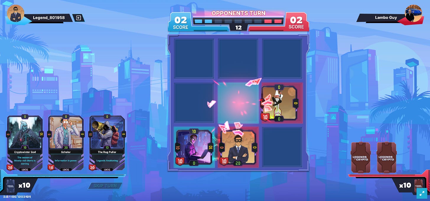 Cards like ‘NFT Hunter’ and ‘Master of Leverage’ present different attacking abilities and health stats. With three to choose from in any given turn, it’s all about optimising the current move for what you’ve got available, and saving those real premium cards for when they’re needed.